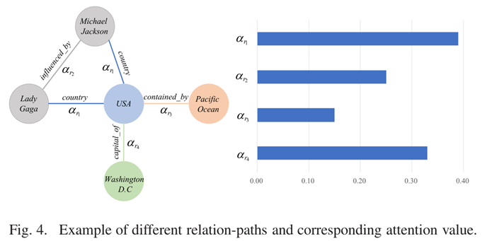 为了验证注意力机制的能力,以FB15k-237数据集为例,在下图中报告了几种关系路径和相应的注意力值。可见,单一关系路径与其注意力值呈正相关。