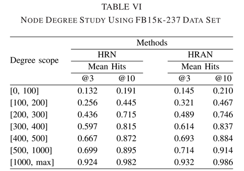 在KGs中,节点的度是指每个实体在所有关系路径下的邻居实体。实体的级别越高,表示包含的邻居实体越多。计算Hits@3和Hits@10的均值结果如下表所示。