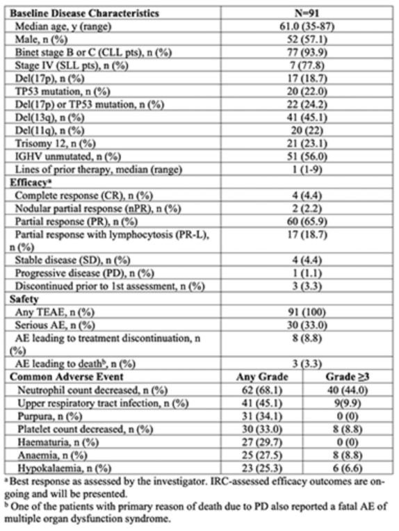 截至2018年12月14日,共纳入91例患者(82例CLL,9例SLL),分别在中国11个医学中心接受治疗,下表概述了疾病的基线特征。中位随访15.1个月(0.8~21.2个月),16例(17.6%)停药,其中8例源于AEs,7例源于PD,1例因患者退出研究。根据研究者评估,83例患者(91.2%,95%CI:83.4,91.6)获得部分缓解伴淋巴细胞增多(PR-L)或更好的治疗反应,17p缺失或TP53突变患者ORR也很高(95.5%)。有治疗反应者中位获得初次治疗反应的时间为2.79个月(2.6~5.6个月)。预估12个月的 PFS率为80.9%(95%CI:67,89)。最常报告的AEs见下表,2例发生大出血(3级消化道出血,2级颅内出血),导致泽布替尼停用。4例(4.4%)患者在最后一次服药后30天内死亡,其中2例死于PD,2例死于AEs(肺部感染、心肺衰竭)。