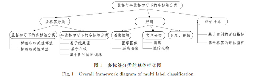 经典的 MLC方法主要分为问题转化(ProblemTransforG mation,PT)和算法自适应(Algorithm Adaptation,AA).PT 是将多标签问题转化成多个简单的单标签分类问题,其中最 常用的是二元相关(BinaryRelevance,BR)方法.BR 方法将 多标签分类问题转化为|L|个不同的二元单标签分类问题, 转化后,选择任何现有的二元单标签分类算法作为基分类器. BR方法未考虑标签之间的相关性,为了解决这一问题,研究 人员提出了分类器链方法(ClassifierChains,CC)[8],它是在 BR算法的基础上,通过链的方法连接由 BR 获得的二元分类 器.标签幂集(LabelPowerGSet,LP)方法也是一种 PT 方法, LP是将多标签问题转化为具有 2|L| 个类标签的多 类问题. 随机子标签集成算法(Random KGLabelsets,RAkEL)[9]是对 LP方法的一种集成使用,其中每个 LP基分类器都是由随机 生成的且互不相同的小规模标签子集训练而成.AA 是修改 现有的算法以适应需要解决的新问题,具体表现为将现有的 单标签分类问题调整为 MLC问题.构建 AA的流行模型包括 k近邻[10]、决策树[11]、支持向量机[12]、神经网络[13]等. 近年来,已有一些关于 MLC 的综述.Zhang等[14]介绍 了多标签学习的基础知识,对8种经典的算法进行了分析和 讨论,总结了多标签学习的在线资源等.Tsoumakas等[15]从 PT和 AA 的角度对多标签进行分类的方法进行了详细的介 绍,简单介绍了一些评估指标,最后比较了 MLC方法的实验 结果.Moyano等[16]对20个数据集上的多标签集成分类算 法进行了比较,根据数据不平衡、标签间相关性的特征来评价 它们的性能.Zhou等[17]针对评估措施和标签相关性问题对 多标签学习进行了讨论,同时讲述了4种具有代表性的多标 签算法的基本思想和技术细节.Zheng等[18]从多标签数据流 分类的角度介绍了 传 统 的 MLC 方 法 并 讨 论 了 它 们 的 优 缺 点,确定了多标签数据流分类的挖掘约束.至今为止,还没有 综述从监督学习和半监督学习的角度对 MLC 进行介绍,同 时也没有综述对多标签的实际应用进行全面的介绍.本文的 总体框架如图1所示.