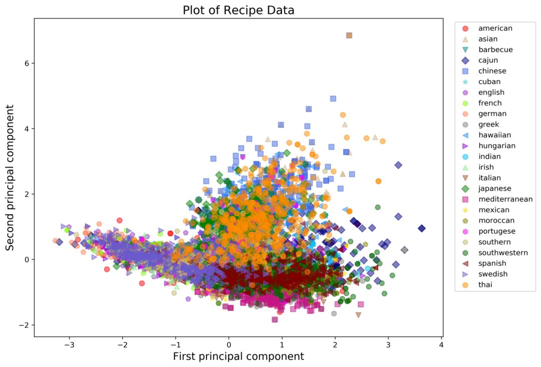 为了能够可视化数据,我实现了降维,以便将1982个维度(对应数据集中不同配料的数量)的特征空间减少到2维。这一步是使用PCA完成的,我保留了前两个主要组成部分。然后,我针对前两个主成分创建了每个食谱的散点图,如下所示: