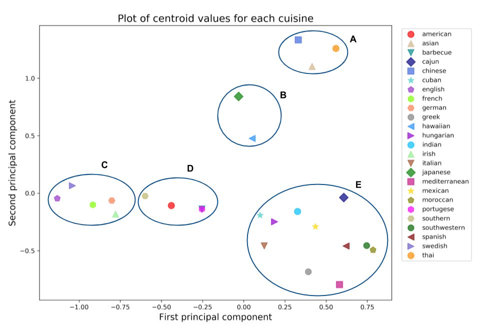 沿着第一、第二主成分的每种不同菜系质心值的图。组(A)与亚洲美食相关,(B)由日本和夏威夷美食组成,(C)和(D)分别是欧洲和美国美食。组(E)是来自世界各地的美食混合,包括古巴,墨西哥,印度和西班牙。