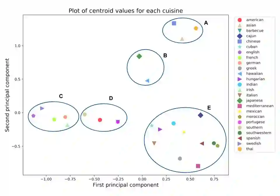 上面的图提供了一些关于不同菜系关系的有趣见解。我们可以观察到质心值倾向于根据类似的菜系对食谱进行分组。例如,图2中的组(A)由中国,泰国和亚洲菜组成,这些都可以归类为亚洲食品。组(B)包括日本料理和夏威夷料理。这两种菜系都非常注重鱼类,因此将它们紧密地组合在一起是有道理的。组(C)完全由瑞典,法国和德国等欧洲美食组成,不远处的组(D)主要由北美菜肴组成。这些包括南部,烧烤和传统的美式菜。最后,组(E)是来自世界各地的美食混合,包括古巴,墨西哥,印度,西班牙和西南美食。当我想到这些美食时,我会想到加重的味道,所以将这些美食紧密地组合在一起是完全合理的。
