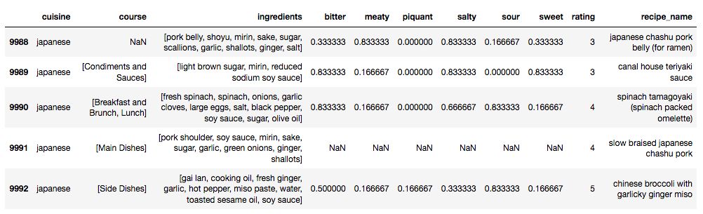 总的来说,我为25种菜系分别下载了大约500份食谱。这就产生了12,500种不同的食谱。关于数据收集,我通过Requests库读取数据,使用内置JSON编码器将JSON数据转换为python字典。之后将数据转换为Pandas DataFrame就相对简单了。下图展示了DataFrame中的某些行: