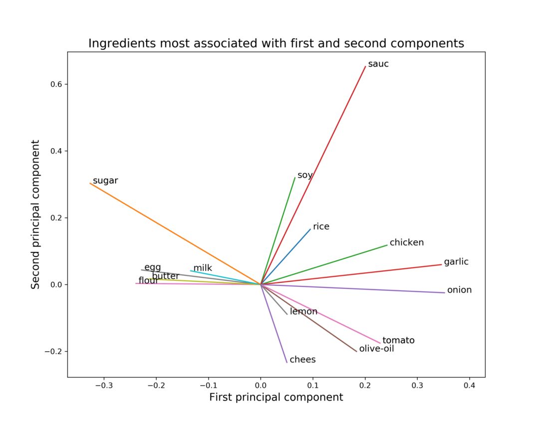 该图是对两个主成分相应的主要特征的直观表示。鸡肉,大蒜,洋葱和番茄等配料沿着主成分1的正方向有很强的联系。这些口味与西班牙或印度菜等美食有很强的联系。另一方面,鸡蛋,黄油,面粉,牛奶和糖在主成分1的负方向上具有强烈的联系。这些是典型的法国或英国菜肴的原料。同样,大豆,酱油和大米与主成分2的正方向有很强的联系。这些配料在亚洲美食中很常见。最后,奶酪,柠檬,橄榄油和番茄与主成分2的负方向有很强的联系。这些口味在意大利和希腊美食中非常常见。该图有助于解释前一个图的结构,即当沿第一和第二主成分绘制时某些菜系在特定区域聚集在一起的原因。