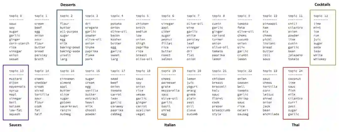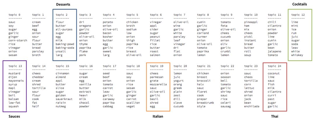 最后,我还运行了一个LDA模型来进行主题建模(见下文)。我很想知道是否有可能根据各种配料通常所属的美食菜系来将其分离。我指定的主题数量为25,因为我知道数据集中有25种不同的菜系。然而,LDA的结果有点混乱。在某些情况下,LDA主题是特定的菜系,比如意大利菜或泰国菜。然而,还有一些主题是不同类别的菜肴,比如甜点,酱汁,甚至鸡尾酒。虽然这个结果不是我想要的,事后看来它实际上是完全合理的。LDA是一种机器学习技术,可以识别出经常出现在一起的单词组(group of words)。因此,在超过12,000个食谱的语料库中,基于菜肴的类型(即甜点,汤,沙拉或酱汁)而非菜系类型,可能存在更强的单词组关联