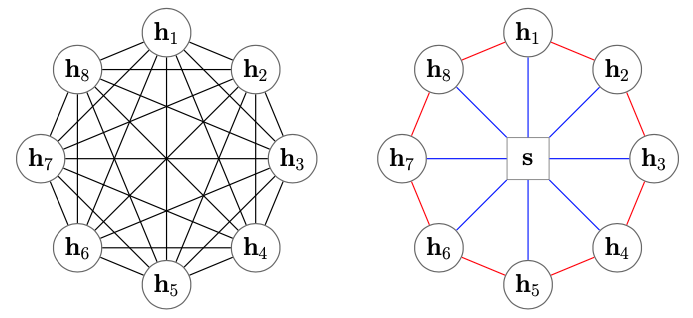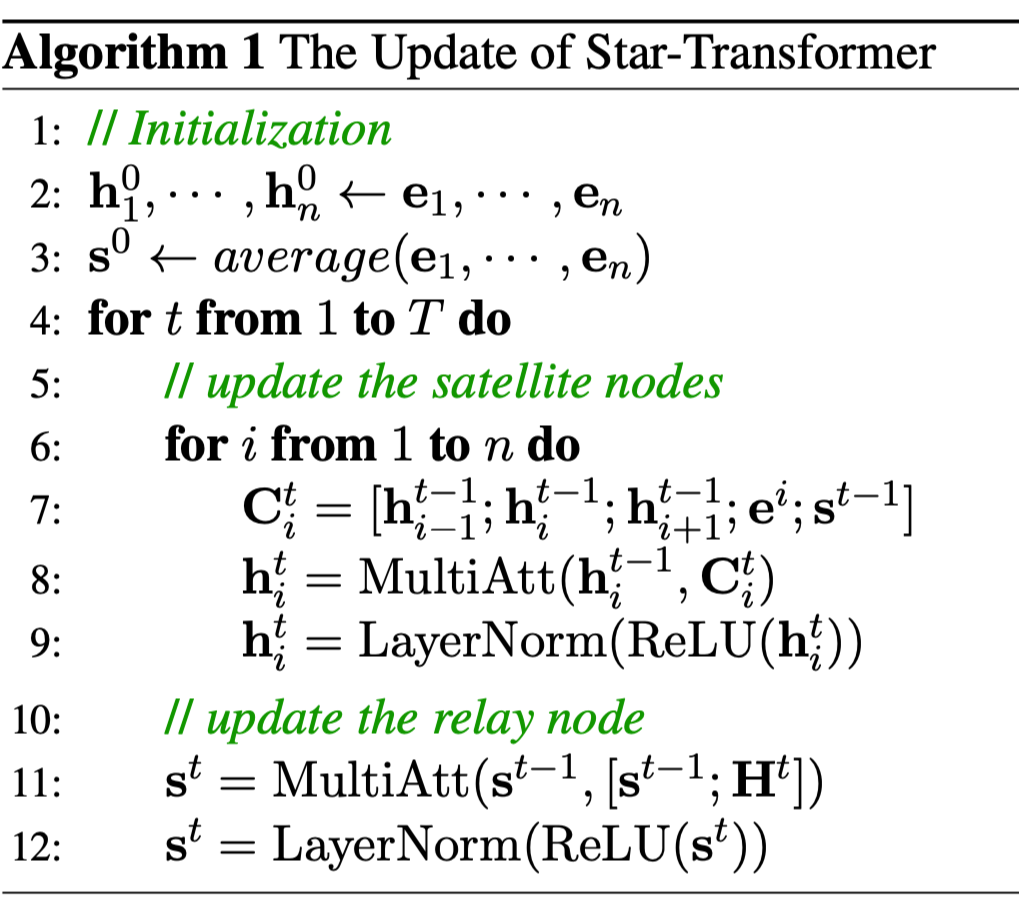 Star-Transformer 用星型拓扑结构代替了全连通结构如上图左边是 Transformer,而右边是 Star-Transformer。在右边的图中,所有序列中直接相邻的词可以直接相互作用,而非直接相邻的元素则通过中心节点实现间接得信息传递,因此,复杂性从二次降低到线性,同时保留捕获局部成分和长期依赖关系的能力。