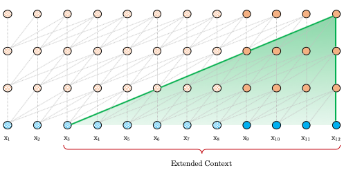 Sliding Window:如上图 (b) 所示,跟 CNN 很像,给定一个固定的窗口大小 w,其两边都有个 w/2 个 token 与其做 attention。计算复杂度降为 O(n x w),即复杂度与序列长度呈线性关系。而且如果为每一层设置不同的窗口 size 可以很好地平衡模型效率和表示能力。