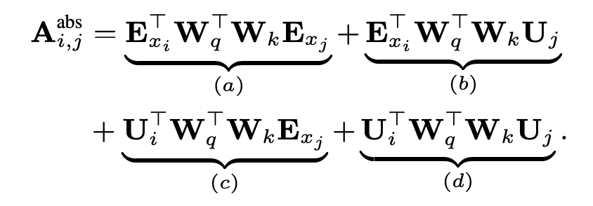 上图是原始 Transformer 和 Transformer-XL 的比较,其中 E 表示词的 Embedding,而 U 表示绝对位置编码。这大一堆看起来奇奇怪怪,实际上 Transformer 的注意力计算是 的分解,即先编码 Q(当前词 i)和 K(其他的词 j)然后算内积,位置编码是直接 add 在词嵌入上面的。