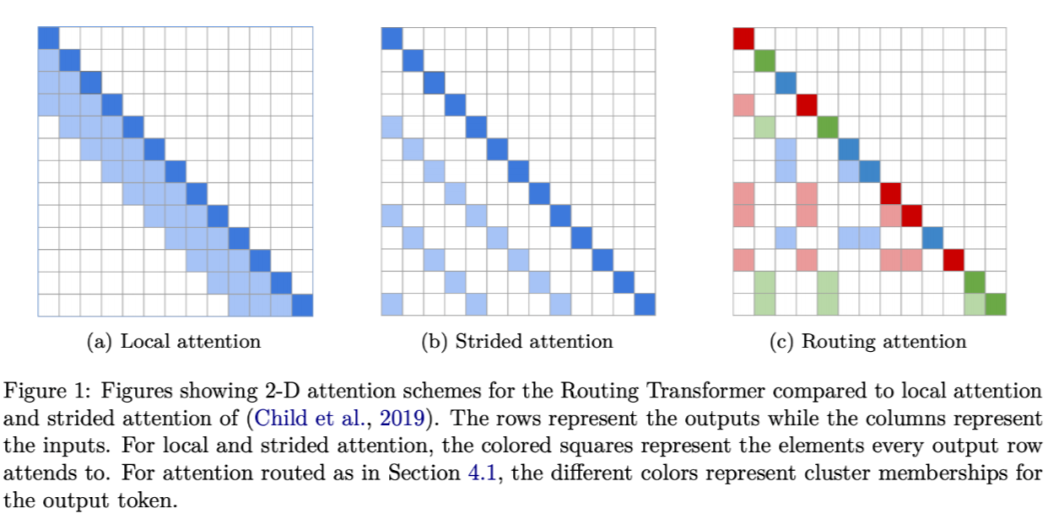 和前两篇文章的目标一样,如何使标准 Transformer 的时间复杂度降低。Routing Transformer 将该问题建模为一个路由问题,目的是让模型学会选择词例的稀疏聚类,所谓的聚类簇是关于每个键和查询的内容的函数,而不仅仅与它们的绝对或相对位置相关。