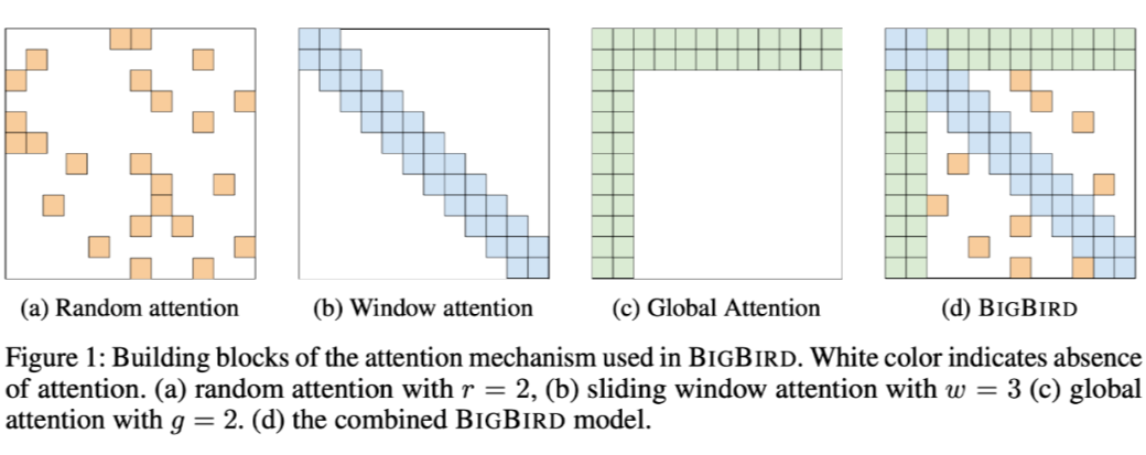 最后把这三部分注意力结合在一起得到注意力矩阵 A,如图 d 就是 BIGBIRD 的结果了,计算公式为:
