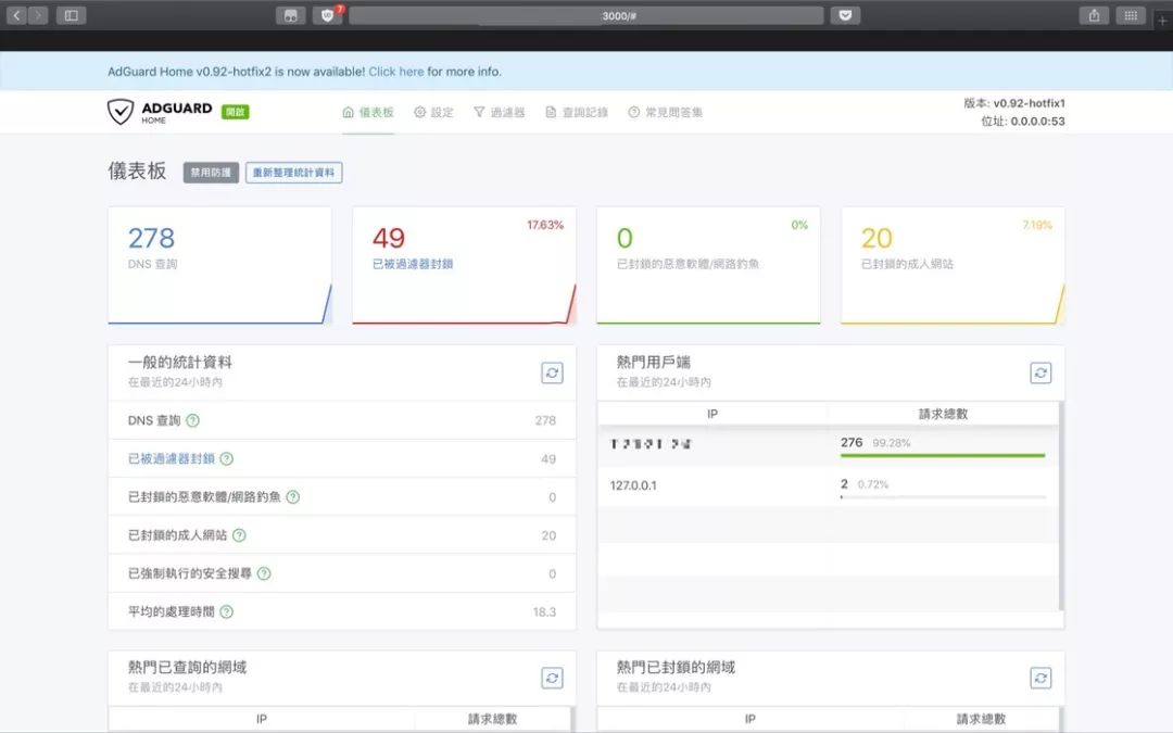在「仪表板」上,我们可以看到 DNS 查询次数、被过滤器封锁的网站、查询 DNS 请求的 IP 地址等等信息。