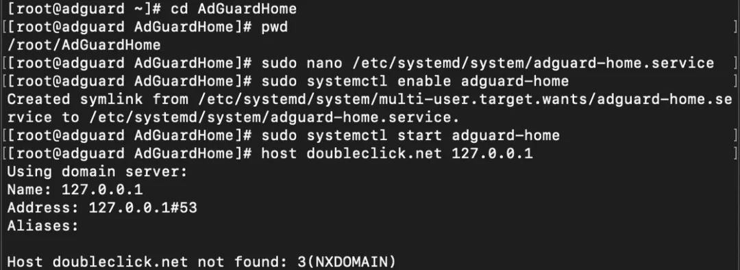 接着,输入运行 AdGuard Home 的命令: