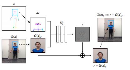 为了在结果中增加人脸的真实感,我们加入了一个专门训练来生成目标人物面部的 GAN。