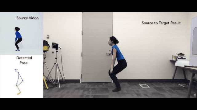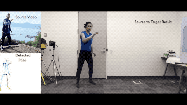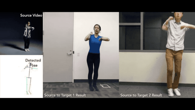 本文提出一种简单的 “跟我做”(do as I do)的动作迁移方法:给定一个人跳舞的源视频,我们可以在目标人物表演标准动作几分钟后将该表演迁移到一个新的目标身上(业余舞者)。