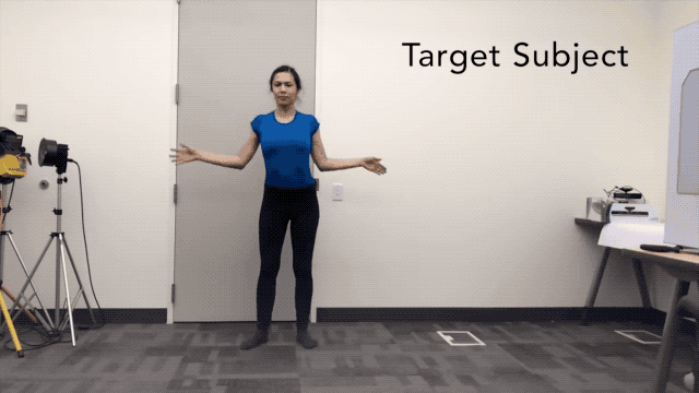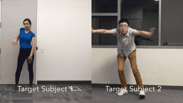 但是,他们并没有用两个实验对象对应的相同动作来直接监督学习这种翻译。即使两个实验对象都做同样的动作,由于每个实验对象的体型和风格差异,仍然不太可能有帧到帧的 body-pose 对应的精确框架。