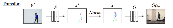 模型使用一个姿势检测器 P : Y′ → X′来获取源视频中人物的姿势关节,这些关节通过归一化,转换为姿势条形图中目标人物的关节。而后,我们使用训练好的映射 G。