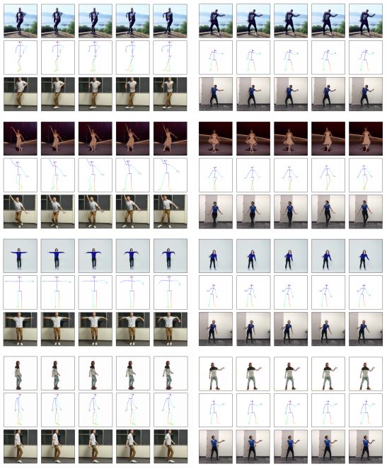迁移的结果。每个部分显示 5 个连续的帧。上面一行显示 source subject,中间一行显示规范化的 pose stick figures,下面一行显示目标人物的模型输出。