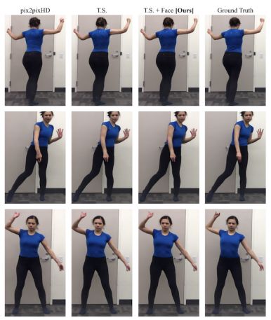 总的来说,新的这个动作迁移模型能够创建合理的、将任意长度的目标人物跳舞的视频,其中他们的舞姿跟随另一个跳舞者的输入视频。虽然我们的设置在很多情况下都可以产生可信的结果,但偶尔会遇到几个问题。
