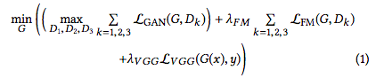 方法是基于 pix2pixHD 中的目标提出来的。在初始条件 GAN 设置中,生成器网络 G 对多尺度鉴别器 D = (D1,D2,D3) 进行极大极小博弈。