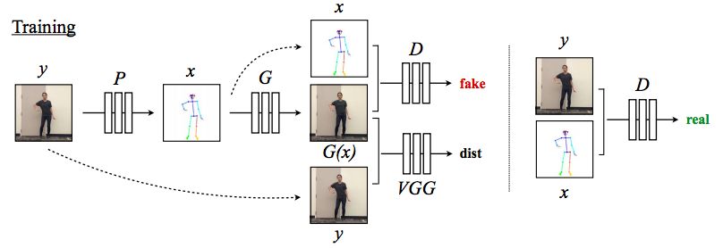 模型根据源视频中给定的帧,使用预训练好的姿势检测器 P 来制作姿势线条图。在训练期间,学习了一种映射 G 和一个对抗性鉴别器 D,来试图区分哪些匹配是真,哪些是假。
