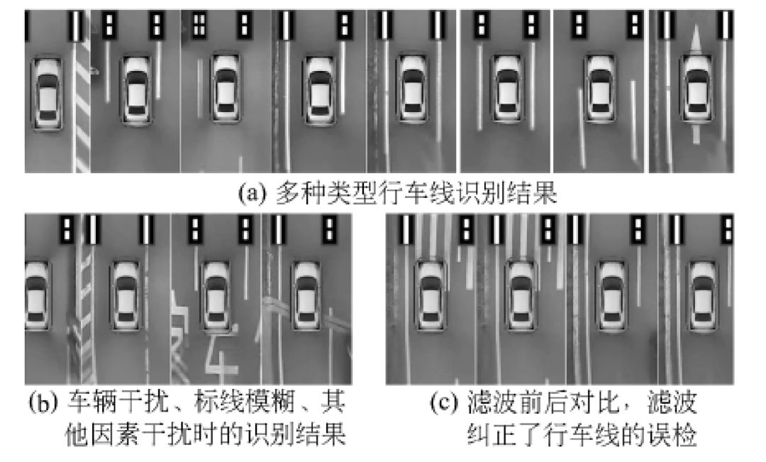 图 4 给出了部分实验结果,其中包含了虚线、实线、双黄线等多种类型及有干扰情况下的识别结果。从实验结果可以看出,本研究基于环视的道路标线检测算法有很高的精确度。