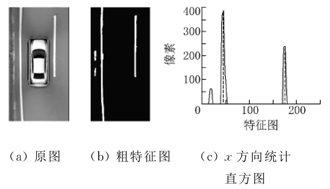 每条行车线均会产生一个峰值,如图 2 所示。当某侧有多个峰值产生时,须对其进行约束,若两个峰值的距离不大于双线间距,则将其融合,否则进行非极大抑制,筛选出最大值,其位置记为 x^t,t 为 L 表示左侧,t 为 R 表示右侧。行车线兴趣区域被限制为(x^t - e,x^t + e),e 为检测裕度。同时可计算车辆中心与车道偏离 λ_t=| x_c - x^t |。