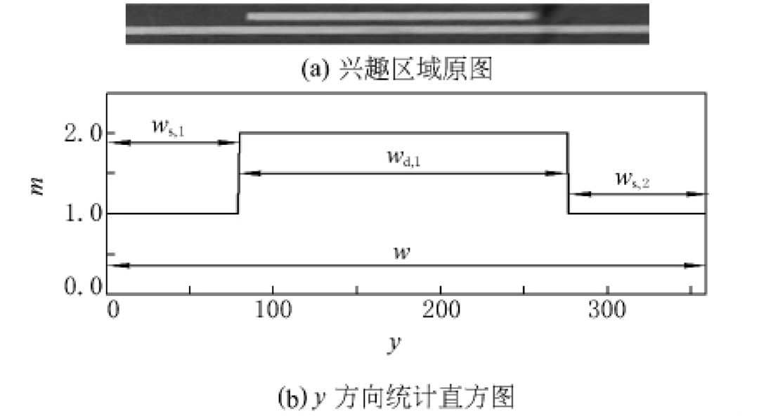 行车线区域提取将感兴趣缩小至每条行车线两侧很小范围内,大大减小了噪声干扰。对于每个兴趣区域,建立 y 方向统计直方图,统计图像在该方向上产生的边缘对。一个边缘对由一个上升沿和一个下降沿组成,本文使用具有亚像素精度的边缘检测方法提高准确度 [11],用滑动平均法滤除由标线部分模糊等因素造成的噪声,得到一条类方波曲线,如图 3 所示,其中:m 为边缘对统计值;w 为 y 轴尺度;w_(s,i) 为相应长度。