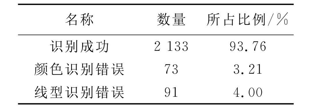 使用环视系统采集了大量数据进行检测与识别,并从中选出 1200 张涵盖 2316 条道路标线的图像进行统计,检测结果如下:召回率 R=99.96%,精确度P=97.23%,R 和P的计算公式为 R=T/(T+F1),P=T/(T+F2),其中:T 为正确检测到行车线的数量;F_1 为漏检的数量;F_2 为检测错误的数量。识别结果如表 1 所示。