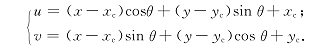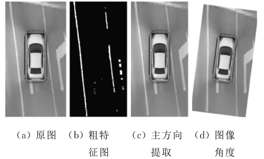 对特征图进行 Hough 变换 [10],得到一类平行线,从中选取最长的线段,作为图像的主方向。在完成了图像主方向提取后,利用主方向对图像进行旋转矫正(如图1(d)所示)。在主方向矫正角度为 θ、矫正基准点为车辆中心(x_c, y_c)的情况下,矫正前图像中的某一个像素点(x, y)在矫正后的坐标(u, v)为: