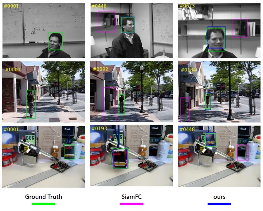 最左边的一列图片中用绿色边界框给出了需要跟踪的目标,后两列的图片展示了在不同的后续帧中的跟踪结果。其中紫色框标出的是SiamFC的结果。在第一行的例子中,目标物体是人的头部,在边界框的右上角是颜色较深的头发,剩余大部分区域是颜色较浅的面部区域。因此,在中间列所展示的图片中,SiamFC给出了背景中符合这种灰度模式的一片区域作为跟踪结果。类似的错误也发生在第二行、第三行所展示的示例中。事实上,前两个例子中的目标物体都具有很强的语义信息,即人的头部和人体。如果跟踪器能够从第一个边界框中提取出语义信息,并且用语义信息进行匹配,那么这两个序列中的背景干扰问题就迎刃而解了。