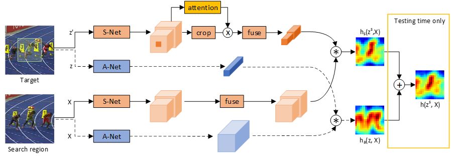 其中由虚线连接的蓝色方框属于外观分支,即原有的SiamFC网络,而实线连接的橘色方框属于语义分支。在语义分支中采用在ImageNet图像分类任务中训练的网络作为语义网络(S-Net),并且冻结该网络中的所有参数,通过训练语义分支中的融合(fuse)模块来实现迁移学习。