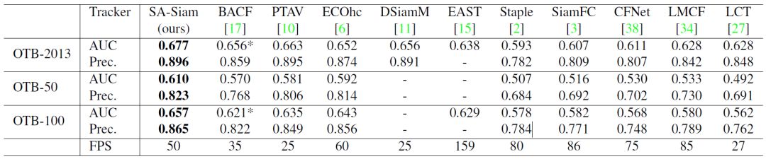 在VOT任务中有两个主要的基准数据集,即OTB(Object Tracking Benchmark)数据集和VOT (Visual Object Tracking)数据集。OTB于2013年由Yi Wu等人首次在CVPR会议上提出,因此首个OTB也被记作OTB-2013或OTB-CVPR2013,OTB-2013数据集包含51个跟踪目标。其后,Yi Wu等人继续扩充并提出了一个包含100个跟踪目标的大数据集,并于2015年发表在T-PAMI杂志上,这个数据集通常被记作OTB-100。与此同时,他们挑选了其中难度较高的50个跟踪目标作为OTB-50。下表展示了SA-Siam在不同OTB数据集上与其他实时跟踪器的性能比较。在SA-Siam提出之时,它的性能远远领先于其它实时跟踪器。