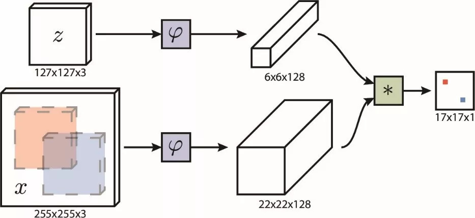 图中z是包含了目标物体的目标图像块,从第一帧视频中截取且无需更新。x是当前帧中的搜索区域。这两个图像块用相同的全卷积网络ψ提取特征,再用相关操作进行匹配,生成响应热力图。在热力图中寻找最大值点,其位置便给出了目标物体在搜索区域内的相应位置。