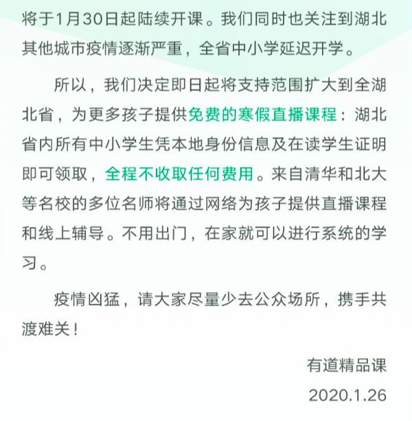 1 月 26 日,网易有道表示,「自有道精品课于 24 日开始向武汉所有中小学生提供免费的寒假直播课程以来,已累计收到 2 万余学生和家长报名及咨询,已审核并通过大部分申请资料,并将于 1 月 30 日起陆续开课」。因湖北省各城市疫情逐渐严重,中小学延迟开学,网易有道决定,「即日起将支持范围扩大到全湖北省,为更多孩子提供免费的寒假直播课程:湖北省内所有中小学生凭本地身份信息及在读学生证明即可领取,全程不收取任何费用。」