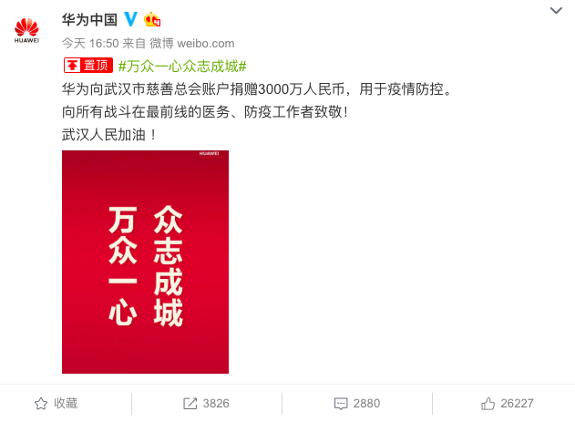华为向武汉市慈善总会账户捐赠3000万人民币,用于疫情防控。
