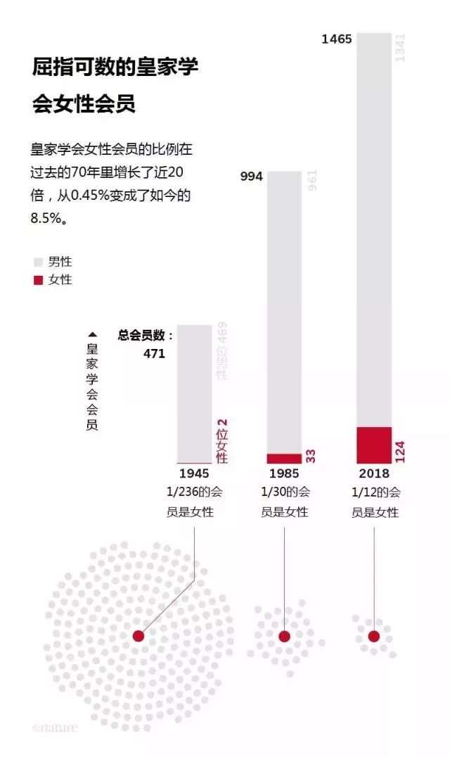 2018年2月,皇家学会的女性会员的数量为124名,只占8.5%。与此相对,2017年英国24%的教授是女性。这样巨大的差异意味着,和男性同僚相比,每个精英女科学家都面临着更大的压力,需要承担更多的责任,比如出席会议、担任评委会成员、指导学生等等。