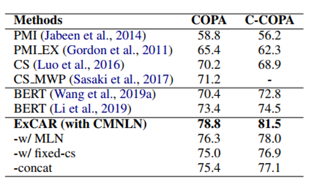 作者在下表中列出了COPA数据集和C-COPA数据集上的结果。实验表明,与基于因果对的BERT相比,ExCAR相关方法的性能有所提高。这表明从事件图中加入额外的证据有助于揭示因果决策机制,从而提高因果推理的准确性。ExCAR-w/ MLN和ExCAR-w/ CMNLN的性能优于ExCAR-concat,后者将CLG简化为一个事件序列。这表明利用逻辑规则之间复杂的因果关系模式可以帮助完成因果推理任务。与ExCAR-w/ fixed-cs相比,ExCAR-w/ MLN和ExCAR-w/ CMNLN的性能有所提高。这证实了神经化规则来解释逻辑规则的不确定性对因果推理任务是有帮助的。与ExCAR-w/ MLN相比,ExCAR-w/ CMNLN进一步提高了预测精度,表明通过整合前因感知势函数,CMNLN可以对因果推理逻辑规则的条件因果强度进行建模。