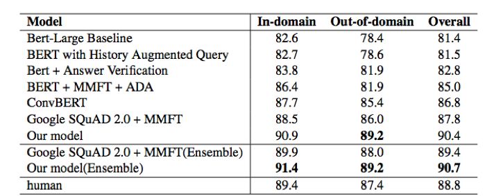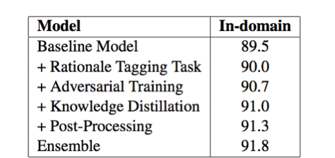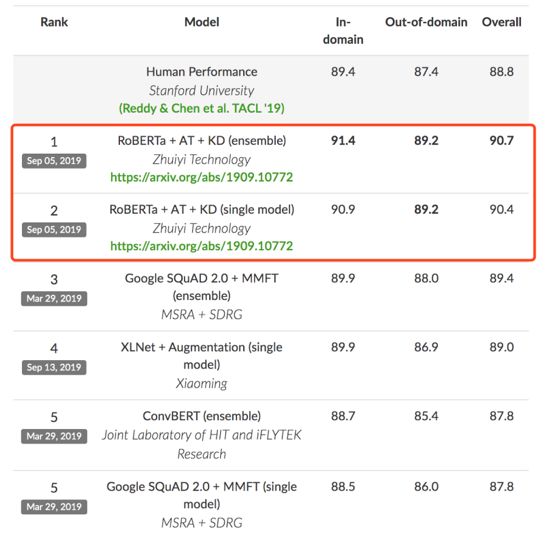 验证集消融实验结果。 最终可以看到,利用对抗训练、知识蒸馏等方法,我们的单模型在RoBERTa Baseline的基础上提升了1.8个百分点。总结 这次的CoQA挑战赛经历,是我们团队站在巨人肩膀上的一次眺望。在优化模型的过程中,我们发现由于预训练模型已经相当强大,以往一些屡试不爽的优化技巧在RoBERTa上却并不能奏效。这就需要我们在比赛的过程中,大胆地设想,仔细地实验,验证不同方法的有效性和稳定性,从而找到真正行之有效的解决方案。希望我们的这次分享也能给其他团队带来一些经验上的启发。 参考文献:[1] CoQA Leaderboard. https://stanfordnlp.github.io/coqa/[2] SQuAD: 100,000+ Questions for Machine Comprehension of Text. https://arxiv.org/abs/1606.05250[3] CoQA: A Conversational Question Answering Challenge. https://arxiv.org/abs/1808.07042[4] RoBERTa: A Robustly Optimized BERT Pretraining Approach. https://arxiv.org/abs/1907.11692[5] BERT: Pre-training of Deep Bidirectional Transformers forLanguage Understanding. https://arxiv.org/abs/1810.04805[6] Adversarial Training Methods for Semi-Supervised TextClassification. https://arxiv.org/abs/1605.07725[7] Distilling the Knowledge in a Neural Network. https://arxiv.org/abs/1503.02531[8] Born Again Neural Networks. https://arxiv.org/abs/1805.04770机器之心「SOTA模型」:22大领域、127个任务,机器学习 SOTA 研究一网打尽。
