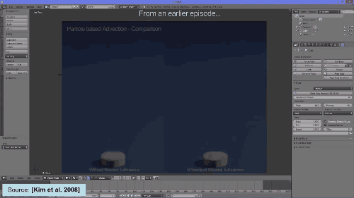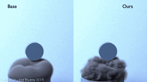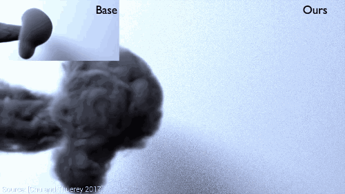 正如你所看到的,它进行了一个非常粗略的基础模拟,并在里面增添了一些细节。这真是一个不可思议的成就。被训练的神经网络其中一个去捕捉相似密度,另外一个捕捉相似涡度。把这两个网络穿起来一起使用,我们可以拿出低分辨率的流体流动过程,去以一种难以置信的方式综合这些细节。它也可以处理边界,这就意味着如果我们的烟喷到一个物体上,这些细节就会被正确的添加。