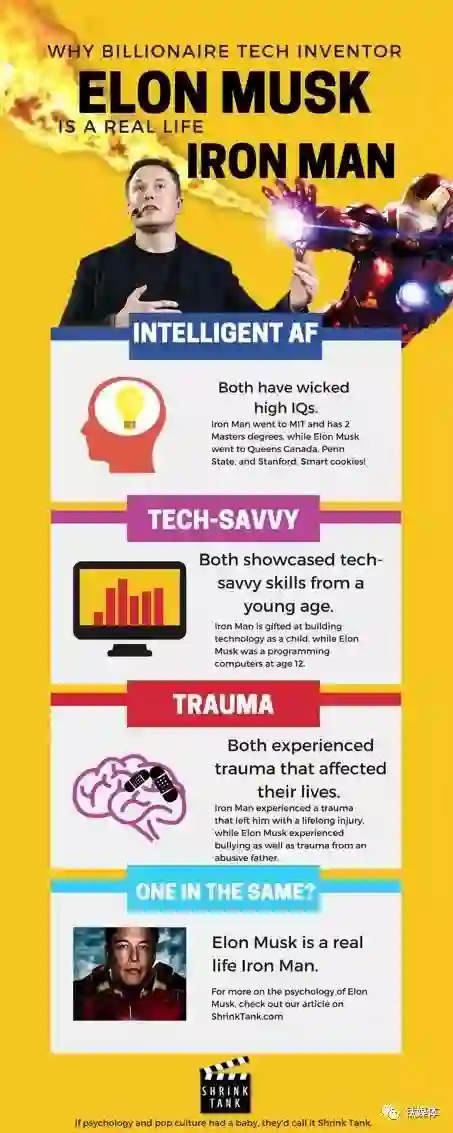 美国一家心理和流行文化研究媒体ShrinkTank,从学历,性格,幼年经历等等角度,将现实中的马斯克和漫威超级英雄世界里的钢铁侠做了比较。最后郑重得出:马斯克是真实世界里的钢铁侠。