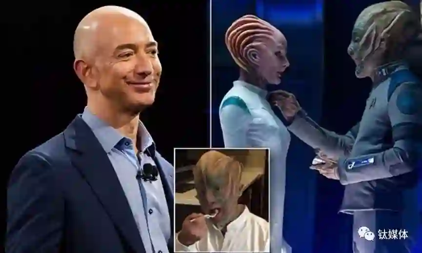 亚马逊CEO杰夫·贝佐斯,这位一直跟马斯克搞商业太空旅行竞赛的老科幻迷,不但也搞了个叫“蓝色起源”(Blue Origin)私人太空飞行公司,还有样学样,在演电影这块也不甘示弱,2016年出演了美国著名的科幻电影老牌《星际迷航3:超越星辰》Star Trek Beyond (2016),咱们来瞅瞅他在这部电影里的扮相。