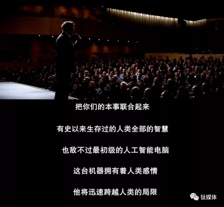 而电影里人工智能科学家威尔在台上的慷慨陈词,跟马斯克后来对人工智能的愿景似乎也如出一辙。