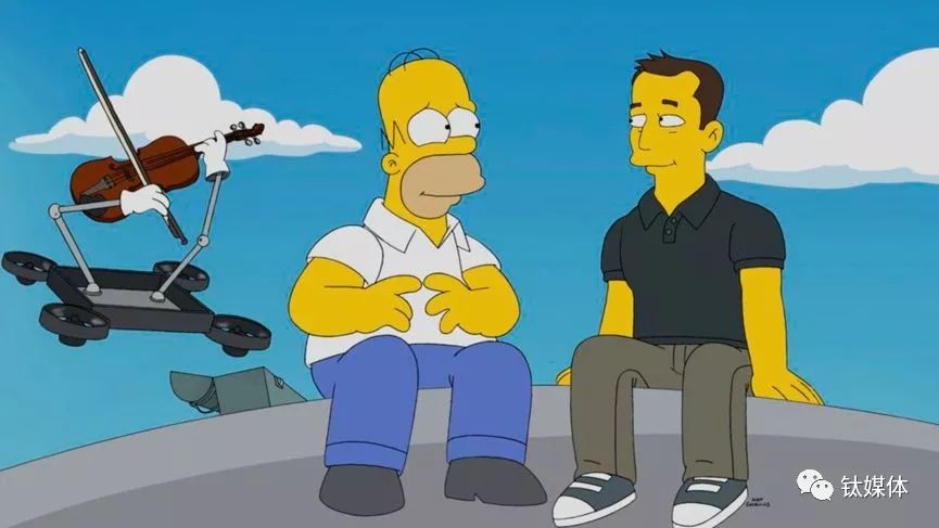 《辛普森一家》剧照 辛普森爸爸正跟马斯克说他的革命性想法