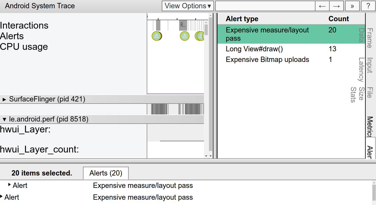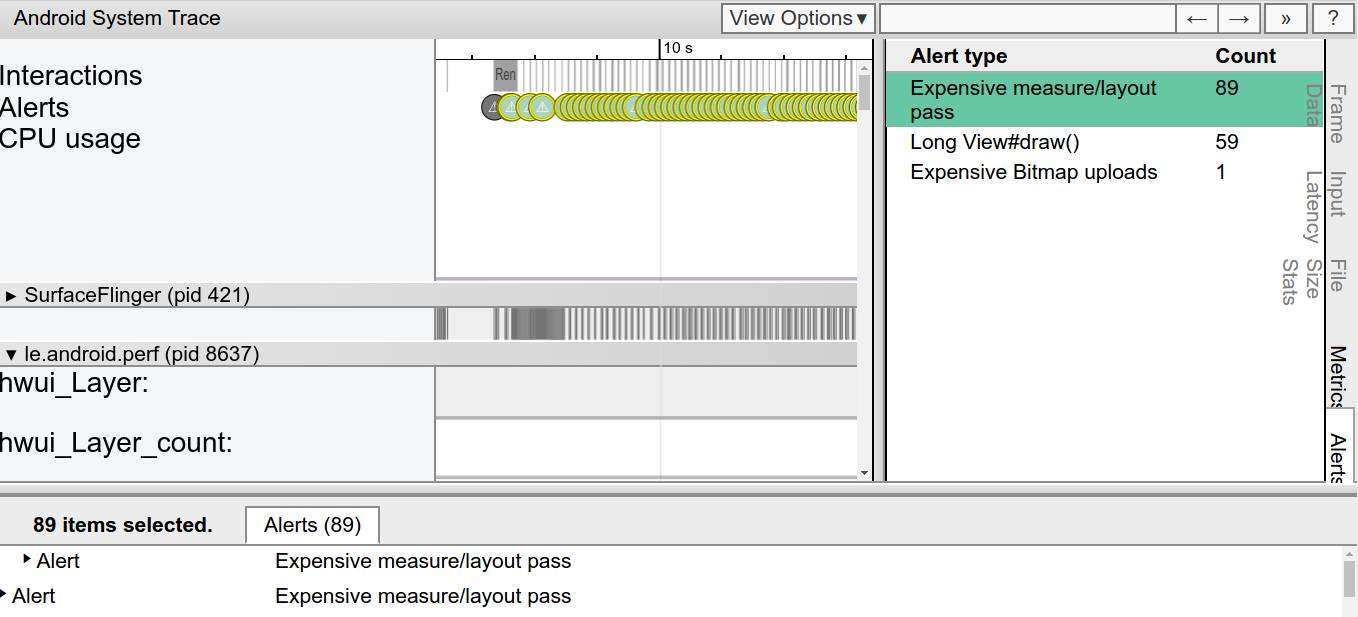 Systrace 会自动突出显示此布局中的(大量)性能问题,并给出修复这些问题的建议。通过点击“Alerts”标签,您会发现,绘制此视图层次结构需要反复执行 80 次的测量和布局阶段,开销极为庞大!