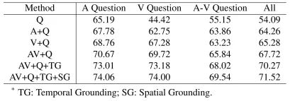 如表 2 所示,引入 Audio 和 Visual 模态信息都有助于模型性能的提升。此外,能明显看到当结合声音和视觉模态时,AV+Q 模型的性能比 A+Q 和 V+Q 模型要好得多,这表明多感官感知有助于提升问答任务的性能。我们也能看到视音空间关联模块和时序关联模块都能够很明显的提升模型的性能,从而更好地对场景进行理解。