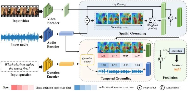 为了解决上述 AVQA 任务,该研究分别从空间和时序感知的角度出发,提出了一种动态视音场景下的空间 - 时序问答模型(如下图所示)。