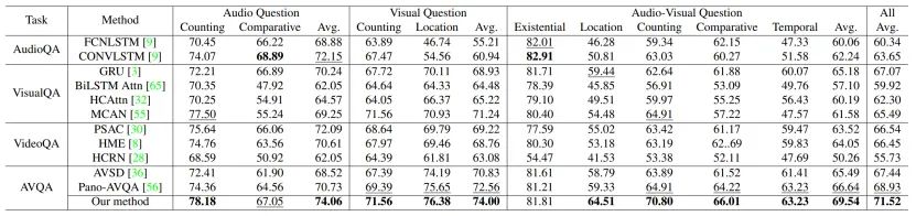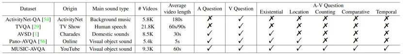近年来,研究人员在声音对象感知、音频场景分析、视听场景解析和内容描述等方面取得了显著进展。尽管这些方法能将视觉对象与声音关联,但它们中的大多数在复杂视听场景下的跨模态推理能力仍然有限。相比之下,人类可以充分利用多模态场景中的上下文内容和时间信息来解决复杂的场景推理任务,如视听问答任务等。现有的视觉问答(VQA)和声音问答(AQA)方法等往往只关注单一模态,从而不能很好的在真实的视音场景中进行复杂的推理任务。