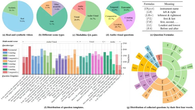 如表 1 所示,该研究发布的 MUSIC-AVQA 数据集具有以下优势:1)MUSIC-AVQA 数据集涵盖大量的声音问题、视觉问题和视听问题的问答对,比其他问答类数据集更全面丰富。对于大多数问答任务数据集(ActivityNet-QA, TVQA 等)来说,仅包含了视觉问题,难以探索视听相关的研究。虽然现有的 AVQA 数据集(AVSD, Pano-AVQA 等)也提供了视听问答对,但它们更专注于相对简单的问题(Existential 或 Location),只需要空间推理即可做出回答。2)MUSIC-AVQA 数据集由包含丰富视听成分的乐器演奏场景组成,有助于更好地研究视听交互场景理解和推理,并可以在一定程度上避免场景中的噪声问题。大多数公开问答类数据集(ActivityNet-QA, AVSD 等)中的声音信息通常与其视觉对象不匹配,会产生严重的噪声(如背景音乐),这使得它们难以探索不同模态之间的关联。此外,TVQA 数据集虽然包含视觉和声音模态,但其声音是由人类说话声组成的,在其问答对构建过程中也只使用了相应的字幕信息,并不是真正的视音关联场景。