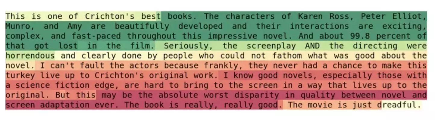 生成文本示例(图像来源:https://blog.openai.com/unsupervised-sentiment-neuron/)。